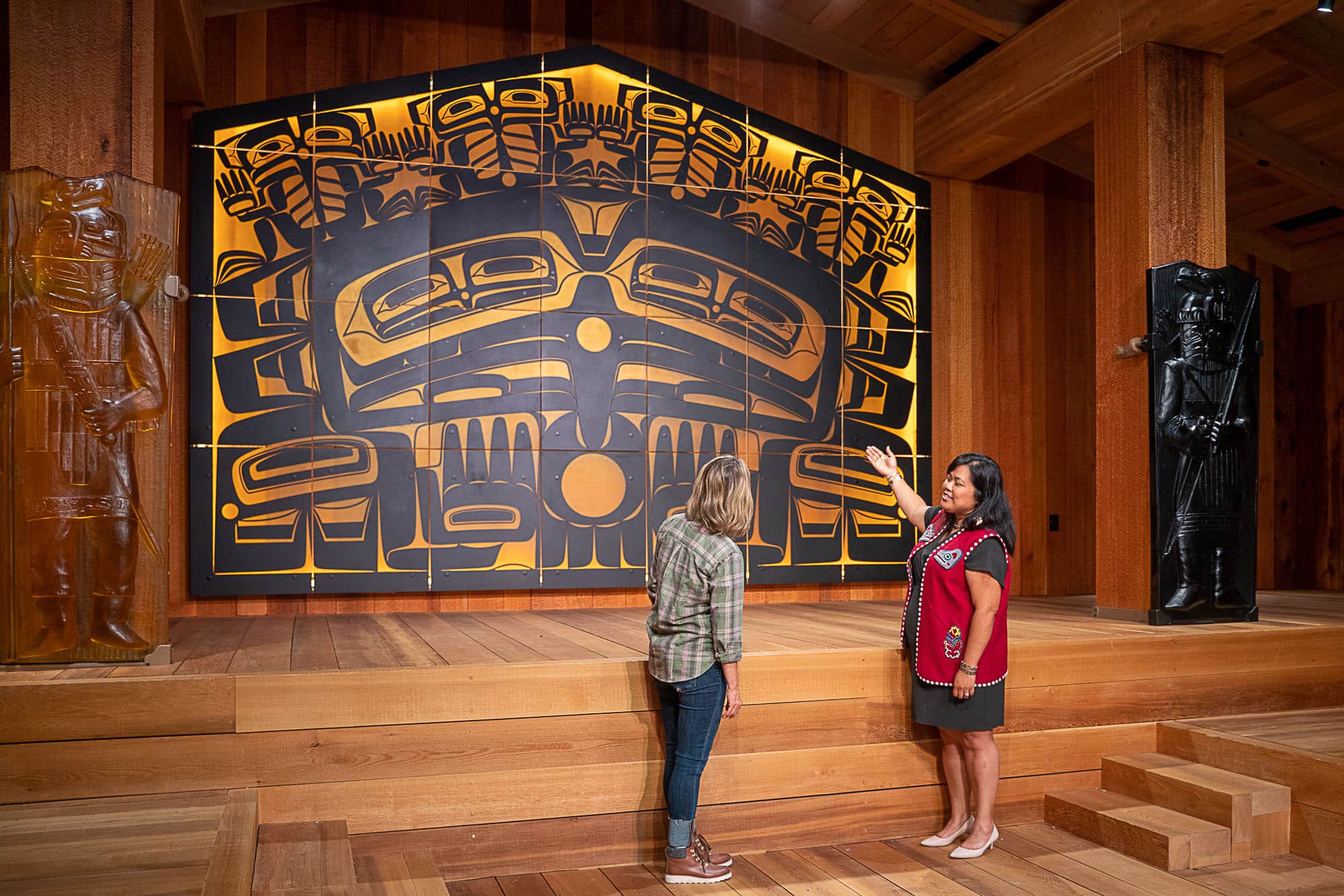 We were looking forward to visiting Alaska and learning more about the culture and heritage that has thrived here for centuries, so we spent time at the incredible Sealaska Heritage. Sealaska focuses on the Southeast Alaska Native people, who have a history going back 10,000 years. One of the coolest things to see is the replica of a Shuká Hut, which gives you an idea of what these clan houses would have looked like in the 1700s. Though if you ask my kids, they’ll tell you it was the workshop where they went to partake in creating one of the Tlingits’ shinier traditions.