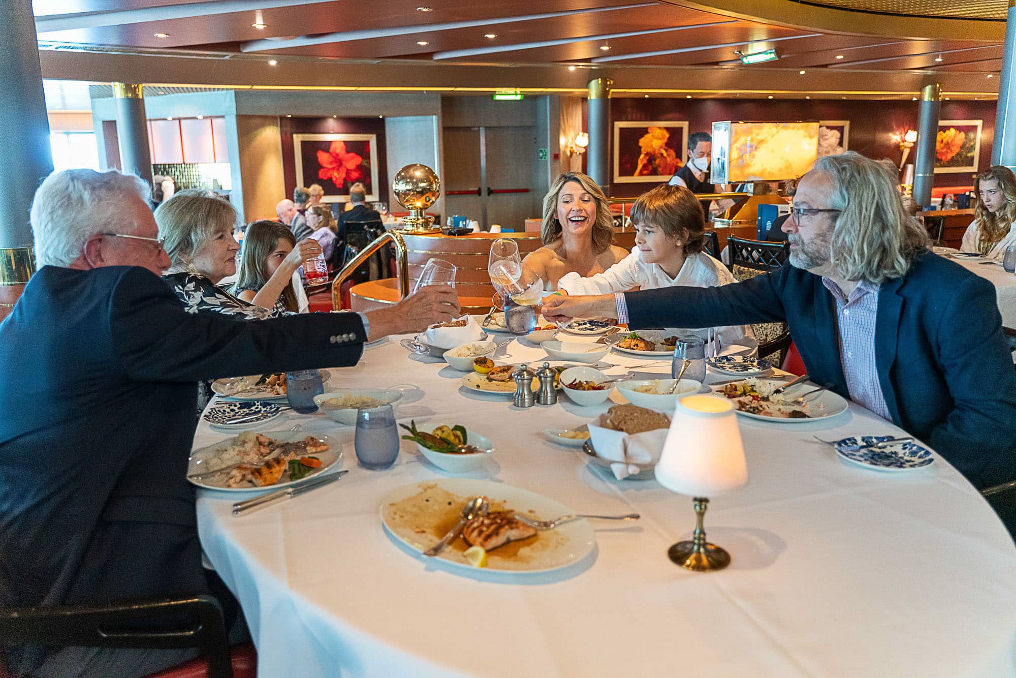 What better way to end a once-in-a-lifetime cruise than back aboard, all dressed up and eating the very salmon Ellis caught us? Our ship has some of the best, world-class chefs at their onboard restaurants and offers for some of their excursions to pick up your fish dockside and cook it for you. We shared our favorite parts of the trip over delicious food. What do you think everyone said?